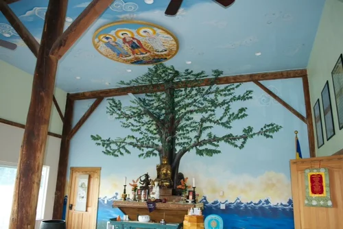 Mural, acrylic, ceiling and east wall of temple, Trout Lake, WA