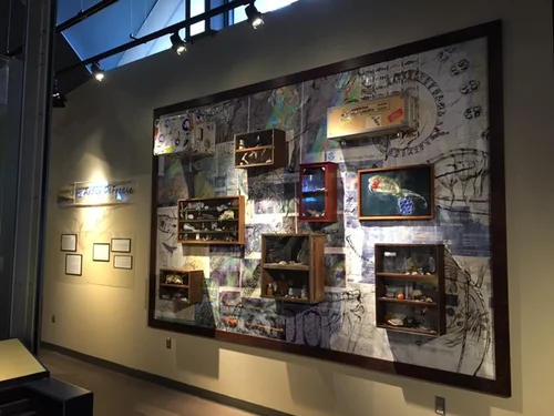 Created for the "Art & Ecology" at Indivisible Gallery, Portland, OR. Mixed media, acrylic paint on board, paper, found object. 2017